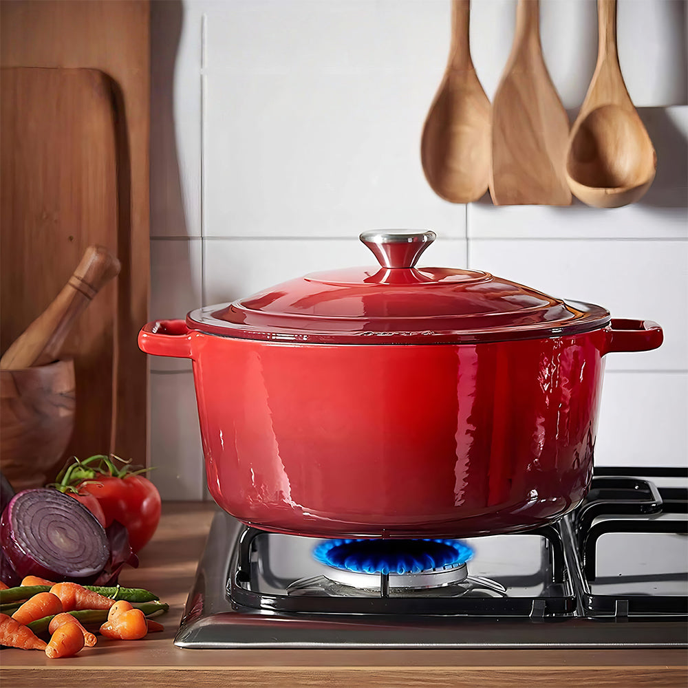 Cook like a pro with this 5-quart Enameled Cast Iron Dutch Oven. Designed for even heat distribution and superior retention, it’s perfect for braising, searing, baking, roasting, and slow cooking. The precision-fit lid locks in moisture and nutrients, while the smooth enamel coating provides a non-stick, easy-to-clean, and non-toxic surface. With induction and oven compatibility up to 500°F, plus included cotton potholders, this Dutch oven is a versatile and safe kitchen essential for family meals and stylish presentation.